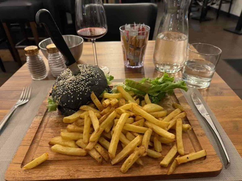 - Main course: Burger L’Occitan-a hamburger topped with onions, a secret sauce and foie gras. The bun was black so I assume it was activated charcoal that was added to the dough. It came with fries.
